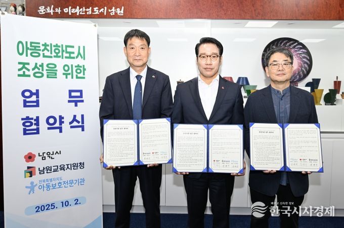 한국시사경제 전북취재본부 | 남원시는 지난 2일 남원교육지원청, 전북동부아동보호전문기관과 함께 아동친화도시 조성 및 아동 권리 증진을 위한 업무협약식을 체결했다.