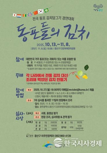 한국시사경제 광주취재본부 | 광주 광산구가 13일부터 11월 18일까지 전국 곳곳에 거주하고 있는 동포들을 대상으로 ‘전국 동포 김치담그기 경연대회_동포들의 김치’를 개최한다.