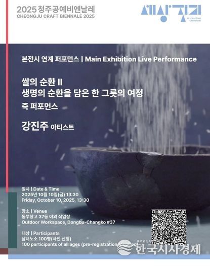 도예를 출발점으로 조각·설치·미디어 등 다채로운 장르를 넘나드는 이헌정과 함께하는 아티스트 토크는 오는 17일 오후 2시에 문화제조창 동부창고 38동에서 진행한다. 2025 청주공예비엔날레 준비한 마지막 국제공예워크숍의 자세한 일정 등은 홍보물을 참고하면 된다.