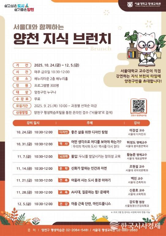 한국시사경제 기동취재팀 | 양천구는 구민의 인문학적 소양을 넓히고 평생학습 문화를 확산하기 위해 서울대 교수진이 직접 출강하는 고품격 교양 프로그램 ‘양천 지식 브런치’를 오는 10월 말부터 7주간 해누리타운 해누리홀에서 운영한다고 10일 밝혔다.