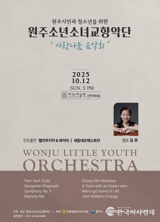 한국시사경제 이정이 기자 | 원주소년소녀교향악단은 오는 12일 오후 5시, 치악예술관에서 ‘사랑나눔음악회’를 통해 지역사회와 함께하는 따뜻한 무대를 마련한다.