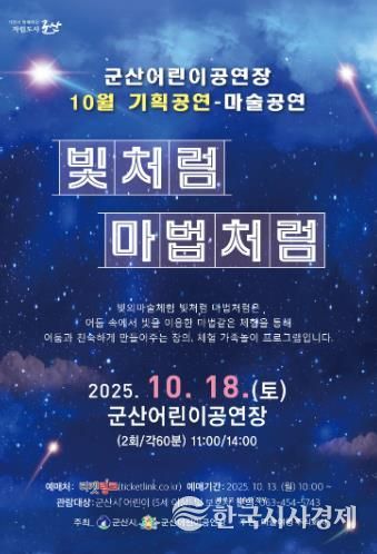 한국시사경제 윤경수 기자 | 군산어린이공연장이 오는 10월 18일 어린이들의 상상력과 창의력을 자극하는 특별한 체험형 공연 '빛처럼 마법처럼'을 선보인다.