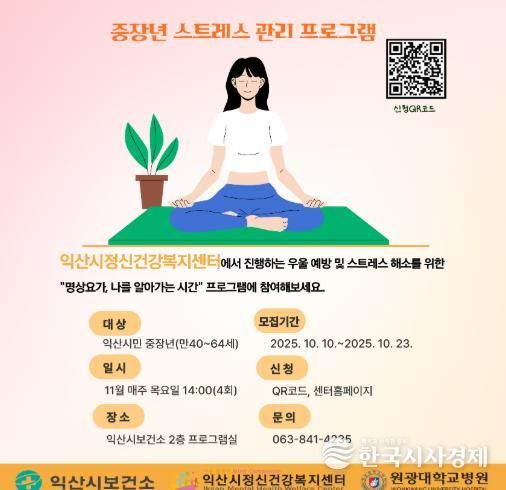 한국시사경제 전북취재본부 | 익산시정신건강복지센터는 만 40~64세 중장년을 대상으로 '마음힐링 명상요가' 프로그램을 운영한다고 10일 밝혔다.