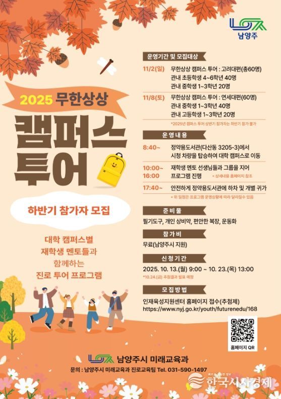 한국시사경제 경기북부취재본부 | 남양주시는 10월 13일부터 10월 23일까지 관내 초등학교 4학년부터 고등학교 3학년을 대상으로 ‘무한상상 캠퍼스 투어’ 참가자를 모집한다.