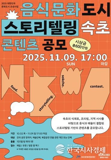 한국시사경제 이정이 기자 | 재단법인 속초문화관광재단은 속초의 대표 음식문화 콘텐츠로 자리매김할 ‘음식문화도시 속초 스토리텔링 콘텐츠’ 공모를 개최한다.