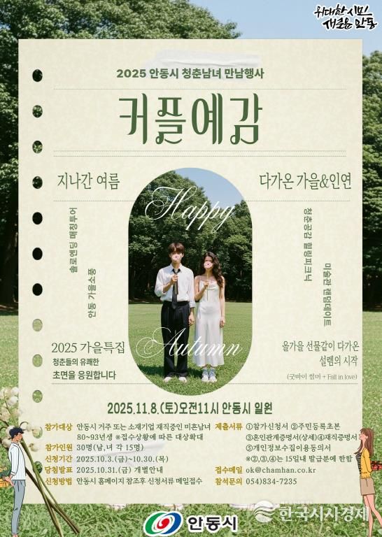한국시사경제 경북취재본부 | 안동시가 청춘남녀의 건강한 만남을 지원하기 위해 마련한 ‘2025 커플예감! 힐링피크닉’ 시즌4 참가 신청을 10월 30일까지 접수한다.
