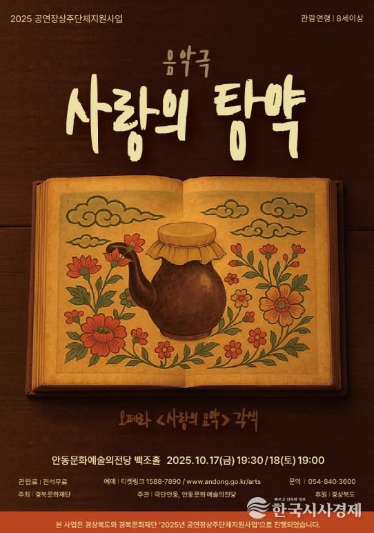 올해 선정된 상주단체 ‘극단안동’은 한국적 소재를 바탕으로 연극과 뮤지컬, 음악극, 거리 퍼포먼스 등 다양한 장르를 넘나들며 활발한 창작 활동을 이어가고 있다. 창작 음악극 '사랑의 탕약'은 10월 17일 오후 7시 30분과 18일 오후 7시, 양일에 걸쳐 안동문화예술의전당 백조홀 무대에서 열린다.