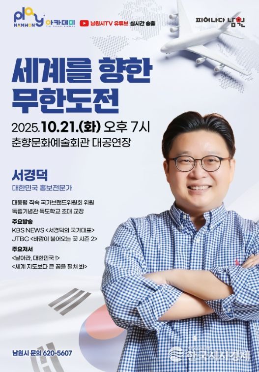 한국시사경제 전북취재본부 | 남원시는 오는 21일 오후 7시, 춘향문화예술회관 대공연장에서 대한민국 홍보 전문가 서경덕 교수를 초청해 “세계를 향한 무한도전”이라는 주제로 플레이(Play) 남원 아카데미를 개최한다.