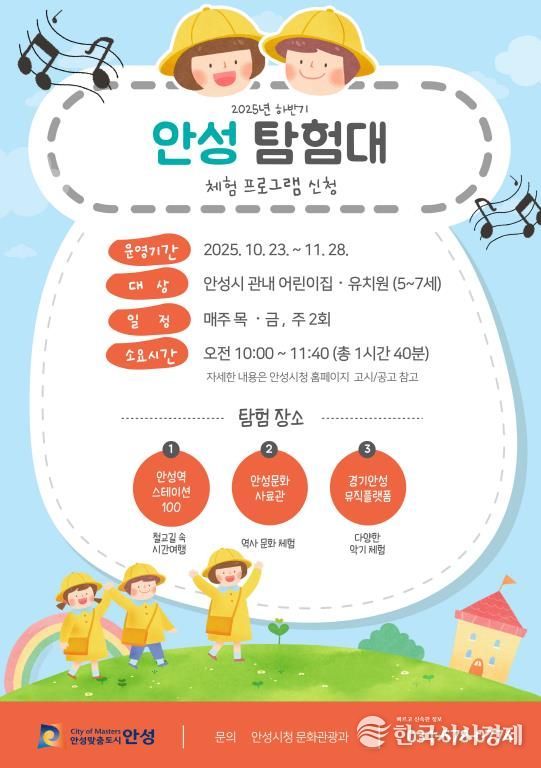 한국시사경제 경기취재본부 | 안성시는 상반기에 시범 운영해 큰 호응을 얻은 유아 대상 체험형 프로그램 ‘안성 탐험대: 역사 속으로, 음악 속으로!’를 하반기에도 운영하며, 지역 문화시설 활성화에 나선다.