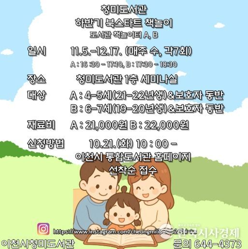 한국시사경제 이정이 기자 | 이천시 청미도서관은 오는 11월 5일부터 12월 17일까지, 유아와 보호자를 대상으로 ‘하반기 북스타트 책놀이’ 프로그램을 운영한다.