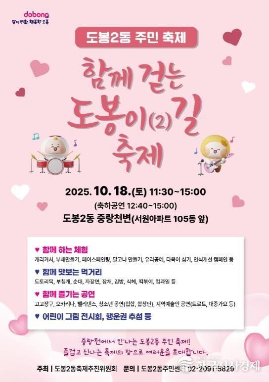 한국시사경제 이정이 기자 | 서울 도봉구가 10월 18일 오전 11시 30분 중랑천변(서원아파트 105동 앞) 일대에서 ‘함께 걷는 도봉이(2)길’ 축제를 개최한다.