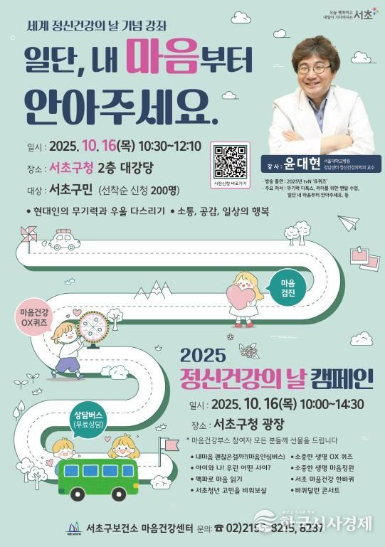 한국시사경제 권충현 기자 | 서울 서초구는 세계 정신건강의 날(10.10.)을 맞아 오는 16일 서초구청 대강당과 보건소 앞마당에서 정신건강 문제에 대한 구민의 인식을 제고하기 위해 ‘2025년 정신건강의 날 기념행사’를 개최한다고 밝혔다. 이번 행사는 ‘일단, 내 마음부터 안아주세요’라는 주제로, 구민들이 일상 속에서 자신과 타인의 마음 건강을 살피며 더불어 살아갈 수 있도록 돕는 데 중점을 두고 진행될 예정이다.