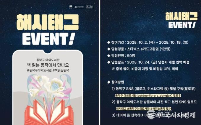 방법은 ▲블로그, 인스타그램 등 구청 공식 SNS 채널 구독 또는 팔로우 ▲야외도서관 방문 ▲자유롭게 책을 읽는 모습이나 현장 촬영 ▲개인 SNS 업로드(해시태그 ‘#동작구 야외도서관 #책 읽는 동작’ 필수) ▲네이버폼을 통한 인증샷 게시물 URL 제출 순으로 하면 된다.