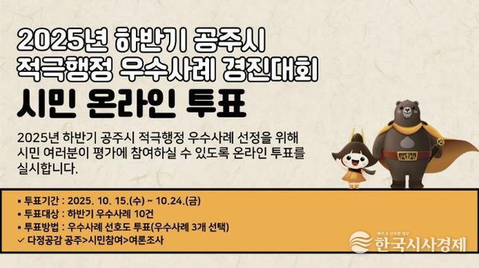 한국시사경제 김태훈 기자 | 공주시는 올해 하반기 적극행정 우수사례 선정을 위해 시민을 대상으로 한 온라인 투표를 10월 15일부터 24일까지 실시한다고 밝혔다.