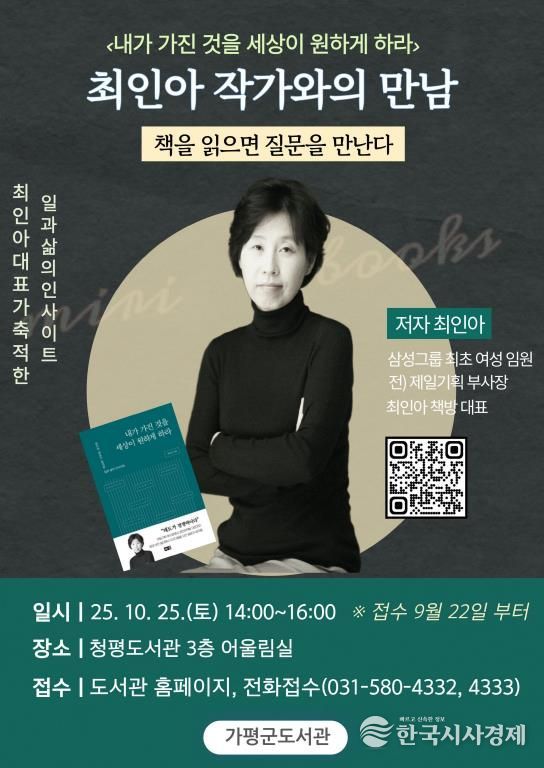 한국시사경제 윤광희 기자 | 가평군은 이달 25일 오후 2시 청평도서관에서 ‘2025년 정기 작가와의 만남’ 강연을 개최한다. 이번 강연은 ‘최인아 책방’ 대표로 잘 알려진 최인아 작가를 초청해 ‘책을 읽으면 질문을 만난다’를 주제로 열린다.