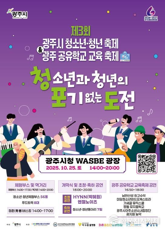 한국시사경제 이정이 기자 | 광주시는 오는 25일 오후 2시부터 8시까지 시청 WASBE 광장에서 ‘제3회 광주시 청소년·청년 축제 청·포·도 · 광주 공유학교 교육 축제’를 개최한다고 14일 밝혔다.