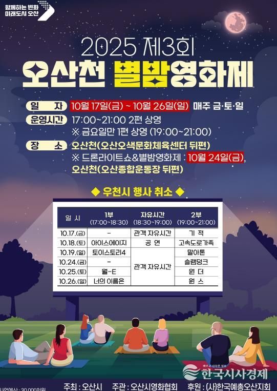 한국시사경제 문화팀 | 오산시는 오는 10월 17일부터 26일까지 매주 금·토·일 저녁, 오산천(오색문화체육센터 뒤편)에서 시민들이 야외에서 영화를 즐길 수 있는 '2025 제3회 오산천 별밤영화제'를 개최한다고 밝혔다.