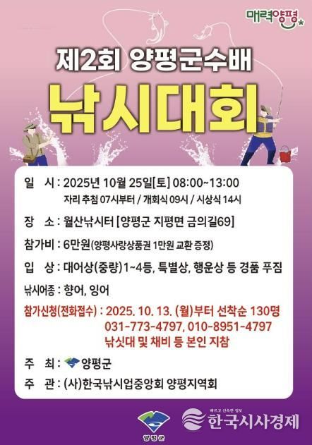 한국시사경제 윤광희 기자 | 양평군은 오는 25일 관내 월산낚시터에서 ‘제2회 양평군수배 낚시 대회’를 개최한다고 밝혔다.