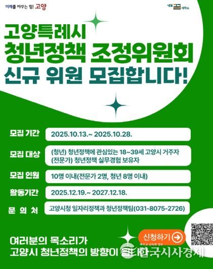 한국시사경제 권충현 기자 | 고양특례시는 청년이 시정의 주체로 참여해 정책을 함께 만들어갈 수 있도록 고양시 청년정책조정위원회 청년 및 전문가 위원을 공개 모집한다고 밝혔다.