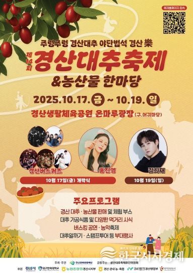 한국시사경제 노승선 기자 | (재)경산문화관광재단은 ‘제14회 경산대추축제 & 농산물 한마당’을 오는 17일부터 19일까지 3일간 경산생활체육공원 온마루광장(구 어귀마당)에서 개최한다.