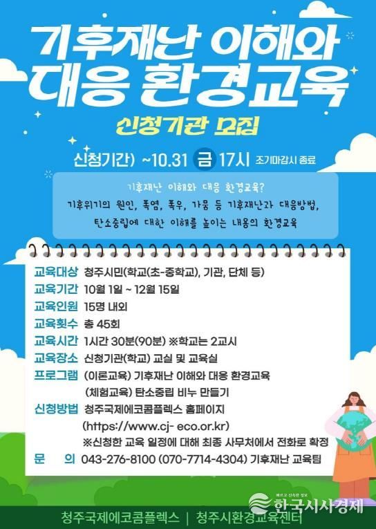 한국시사경제 오영주 기자 | 청주시 환경교육센터(청주국제에코콤플렉스)는 기후위기로 인해 빈번해지는 기후재난에 능동적으로 대처하고, 청주시민의 환경 인식 및 지속적 실천 활동을 유도하기 위해 환경교육을 실시한다고 15일 밝혔다.
