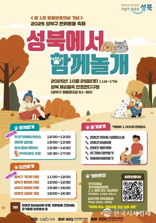 한국시사경제 이정이 기자 | 서울 성북구가 2025년 성북구 반려동물 축제 ‘성북에서 함께놀개’를 오는 10월 25일 토요일 성북 제2월곡잔디구장에서 개최한다.