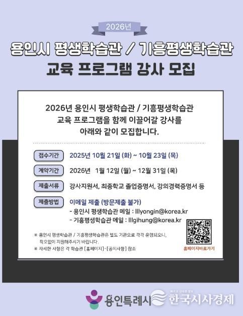 한국시사경제 사회팀 | 용인특례시는 21일부터 23일까지 3일간 ‘2026년 평생학습관 프로그램’을 운영할 강사를 모집한다고 15일 밝혔다.