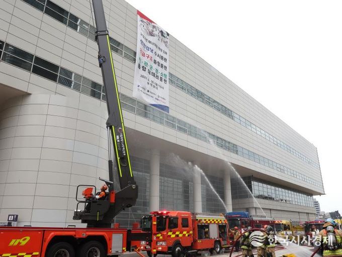 전기차 화재 대응 훈련은 실제 폐차 차량에 불을 붙여 진행하며, 소방헬기를 이용한 로프 들것 구조, 드론을 활용한 호흡기 전달 훈련도 함께 이뤄진다. 의용소방대와 자원봉사자들은 건물 안팎에서 대피 유도에 나선다.