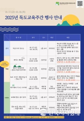 한국시사경제 문화팀 | 경상북도교육청 청도도서관은 오는 10월 17일부터 30일까지 지역 주민을 대상으로 '2025년 독도교육주간 행사'를 운영한다.