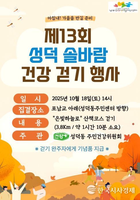 이경희 건강증진과장은 “지역주민과 성덕동 주민건강위원회가 함께 준비한 이번 행사를 통해 시민들이 걷기의 즐거움을 느끼고 스스로 건강을 지켜가는 계기가 되길 바란다.”고 말했다.