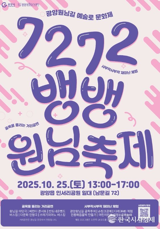 한국시사경제 이정이 기자 | 광양문화도시센터는 오는 10월 25일 금요일 오후 광양읍 인서리공원 일대에서 광양원님길 브랜드 축제 ‘7272뱅뱅원님축제’를 개최한다고 밝혔다.