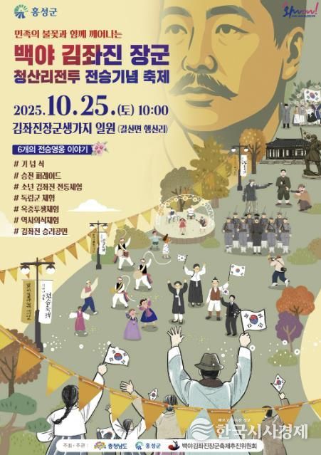 오는 25일 열리는 백야 김좌진 장군 청산리 전승기념 축제는 갈산면 행산리 김좌진 장군 생가 일원에서 개최되며, 청산리 전투 퍼레이드, 헌화·분향, 공연, 역사 체험 프로그램 등 세대와 계층을 아우르는 다채로운 프로그램이 운영될 예정이다. 특히 축제 참가자들은 김좌진 장군의 삶과 기개를 느낄 수 있는 전시와 퍼포먼스를 직접 체험하며 역사적 의미를 공유할 수 있다.