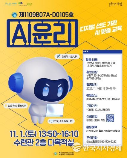 한국시사경제 사회팀 | 부평구 청소년수련관은 오는 24일까지 부평 내 11~13세 청소년을 대상으로 ‘AI 윤리’ 참가자를 모집한다.