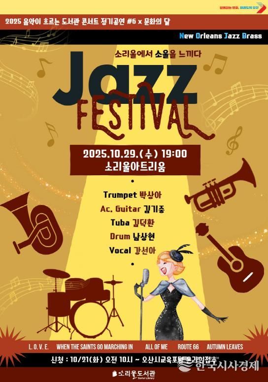 한국시사경제 문화팀 | 경기도 오산시는 오는 10월 29일 오후 7시, 소리울도서관 3층 소리울아트리움에서 '2025 음악이 흐르는 도서관 콘서트 정기공연 #6 × 문화의 달 – Jazz Festival; 소리울에서 소울을 느끼다'를 개최한다고 밝혔다.
