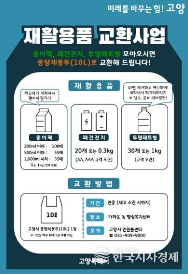 한국시사경제 권충현 기자 | 고양특례시가 2회 추가경정예산을 통해 2천만 원을 확보해 시민들의 호응 속에 추진 중인 재활용품 교환사업을 계속 이어간다.