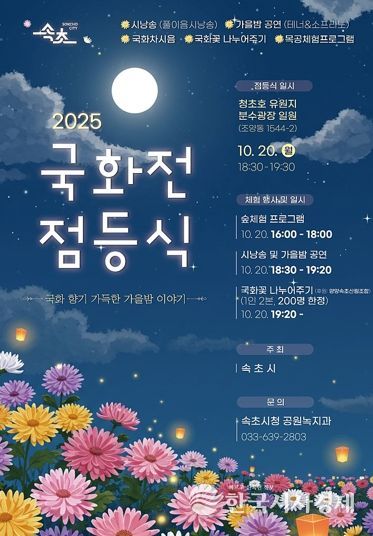 속초시는 10월 20일부터 11월 30일까지 40일간 청초호유원지 분수광장 일원에서 ‘2025 속초 국화전’을 연다. 사랑을 테마로 한 작품 국화와 경관조명이 어우러져 낮에는 꽃으로, 밤에는 빛으로 물드는 가을 속초의 아름다움을 선사한다.