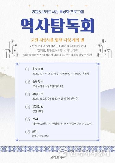 한국시사경제 이정이 기자 | 용인특례시 보라도서관은 오는 11월 7일부터 12월 5일까지 고전 인문학 프로그램으로 ‘2025 역사 탐독회’를 운영한다고 21일 밝혔다.