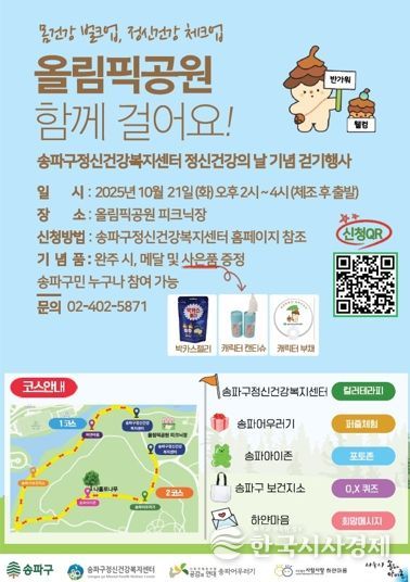한국시사경제 권충현 기자 | 완연한 가을을 맞아, 서울 송파구가 오는 21일 오후 2시 올림픽공원 일대에서 정신건강의 날 기념 걷기 행사 ‘몸건강 벌크업, 정신건강 체크업’을 개최한다고 알렸다.