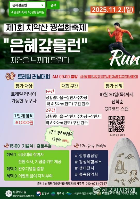 한국시사경제 이정이 기자 | 환경과 생태, 그리고 지역 고유의 설화를 함께 즐길 수 있는 제1회 치악산 꿩설화 축제 ‘은혜갚을런’이 오는 11월 2일 원주시 신림면 성림체험학습장 일원에서 개최된다.