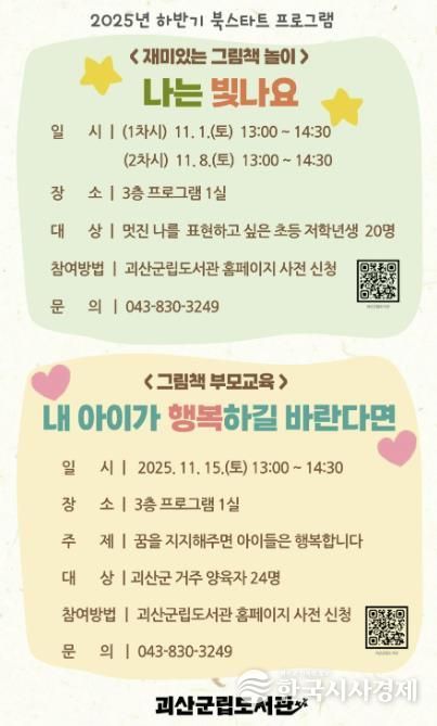 한국시사경제 충북취재본부 | 충북 괴산군은 오는 11월 1일부터 15일까지 매주 토요일, 괴산군립도서관에서 어린이와 양육자를 위한 ‘하반기 북스타트 프로그램’을 운영한다고 20일 밝혔다.