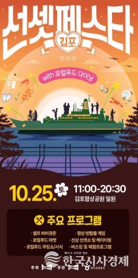 시 관계자는 “김포 선셋 페스타는 함상 석양을 배경으로 로컬푸드 미식과 문화 콘텐츠가 어우러지는 색다른 축제”라며 “안전하고 쾌적한 환경에서 시민과 관광객 모두에게 잊지 못할 경험을 제공하겠다”고 말했다.