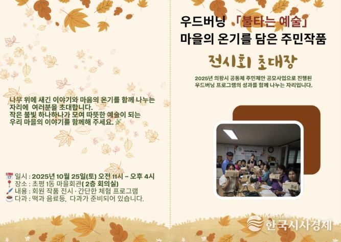 한국시사경제 문화팀 | 의왕시는 마을공동체 자강불식이 오는 10월 25일 초평1동마을회관(윗새우대북길 14)에서'우드버닝, 불타는 예술'작품전시회를 개최한다고 밝혔다.