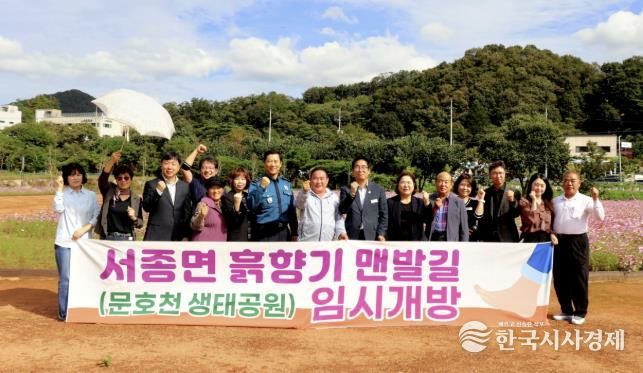 한국시사경제 기동취재팀 | 양평군 서종면은 지난 17일 오후 1시, 서종면 문호리 968 일대 문호천 생태공원에서 ‘서종면 흙향기 맨발길’ 임시 운영을 기념하는 걷기 행사를 개최했다.
