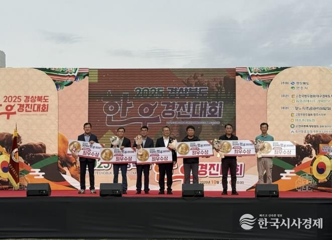 한국시사경제 노승선 기자 | 예천군은 21일, 영주시 문정둔치에서 열린 ‘2025년 경상북도 한우경진대회’에서 예천군 풍양면 김영휘 씨가 암송아지 부문 최우수상을 수상해 예천한우의 우수성을 널리 알렸다고 밝혔다.