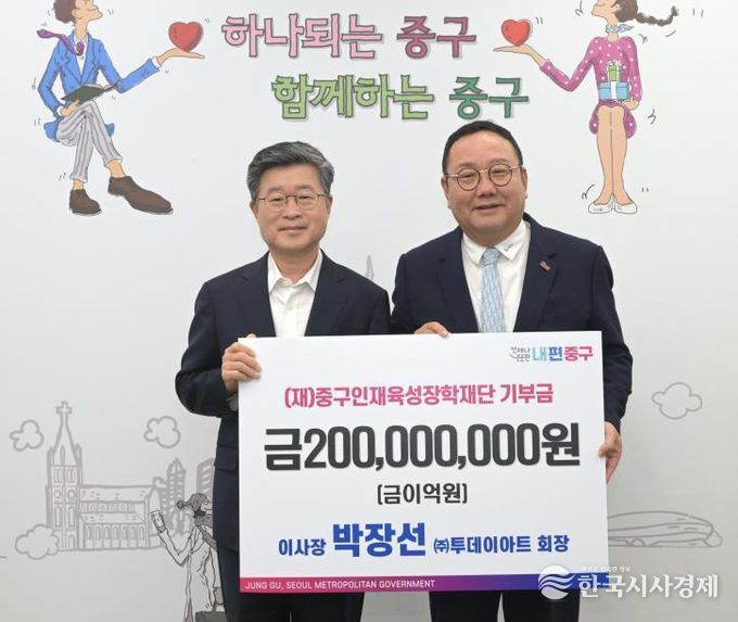 한국시사경제 노승선 기자 | 서울 중구는 ㈜투데이아트 박장선 회장이 서울중구인재육성장학재단에 지역 인재 육성을 위한 장학금 2억원을 기탁했다고 22일 밝혔다. 전달식은 지난 21일 중구청장실에서 열렸다.