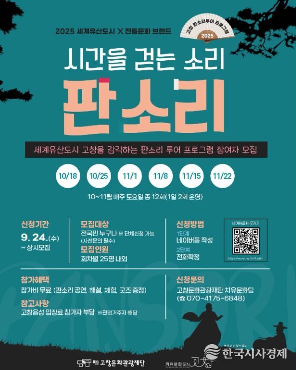 한국시사경제 김숙영 기자 | 고창문화도시센터가 판소리 투어 프로그램 ‘시간을 걷는 소리:판소리’를 오는 11월 22일까지 매주 토요일마다 2차례씩 운영한다.