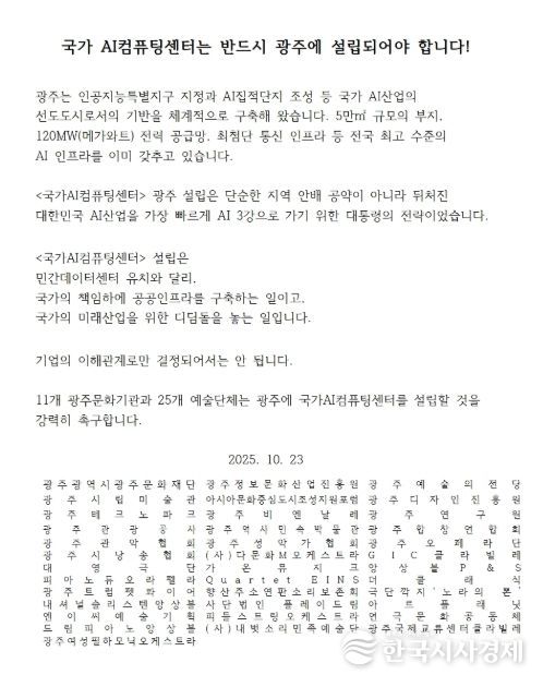광주문화예술계는 “AI산업의 균형발전과 국가경쟁력 강화를 위해 광주에 국가AI컴퓨팅센터가 설립되어야 한다”며 “문화예술과 기술이 공존하는 창의도시 광주에서 대한민국 AI산업의 새로운 도약이 시작되길 바란다”고 덧붙였다.