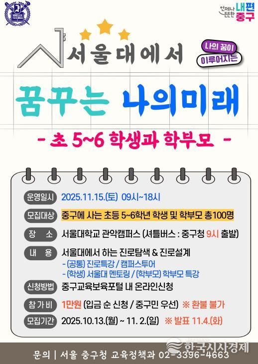 한국시사경제 노승선 기자 | 서울 중구가 오는 11월 15일과 22일, 서울대학교 관악캠퍼스에서 관내 초·중학생 및 학부모를 대상으로 하는 '2025 서울대연계 진로심화 프로그램 '꿈꾸는 나의 미래''를 운영한다.