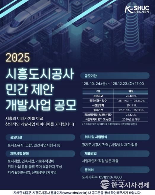 한국시사경제 경기취재본부 | 시흥도시공사는 민간의 창의적인 개발 아이디어와 공사의 개발사업 역량을 결합하여, 신규 개발사업을 발굴하기 위한 ‘민간 제안 개발사업 공모’를 추진한다고 24일 밝혔다.