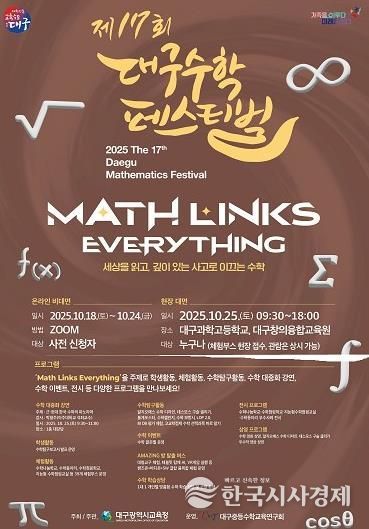 한국시사경제 대구취재본부 | 대구시교육청이 주최하고 대구중등수학교육연구회가 운영하는 ‘제17회 대구수학페스티벌’이 10월 25일 9시 30분부터 대구과학고 및 대구창의융합교육원에서 'Math Links Everything(수학은 모든 것을 연결한다)'이라는 주제로 개최된다.